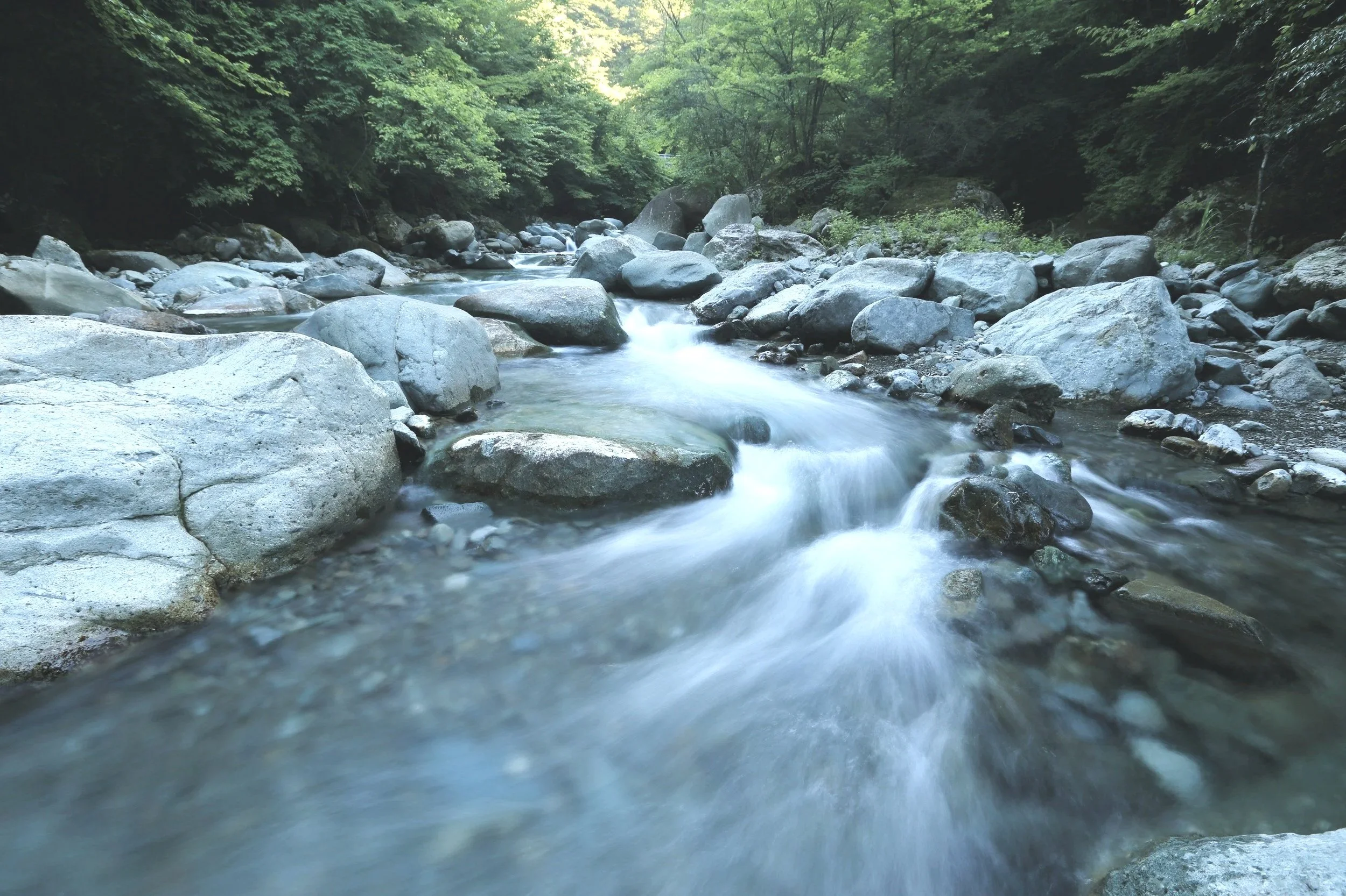 A serene river flowing through a lush valley surrounded by tall trees and mountains, with a pastel-colored sky at dusk.